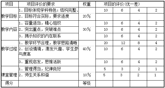 解析 新课程指导下的教学评价目的在于促进发展.更好地激发教师不断进取的积极性和创造性,提高教师自身的政治素养,保持对本课程教学工作的热情,更好地实现教学目标。因此要注重评价内容综合化、评价方式多样化、评价目的重在促进发展,注重评价主体多元化、关注发展过程。因此,该评价表总体设计上存在着以下问题: (1)评价内容应该综合化,包括学生的知识目标、能力目标、情感态度价值观目标的综合评价。而在这个量表中只体现了教师的教学内容,缺少对学生在教学活动中知识掌握程度、能力提高、情感态度价值观的评价,不能够很好地实现教学目标。 (2)评价方式应多样化,要采取质性评价、定性和定量相结合。而在这个量表中评价方式以分数来量化,不能够给教师以建设性意见以促进教学质量的提高。 (3)评价目的应是促进教师与学生的共同发展,并通过反馈来提高教师的教学水平,因此评价目的应该体现对教师教学问题的针对性指导和意见反馈。而在这个量表中,评价要求模糊,而且没有针对性,不能达到评价的目的。 (4)评价主体应该多元化,不仅要包括教师评价,还应包括学生、家长及学校的评价。而在这个量表中评价主体单一,只有教师评价,没有发挥学生、家长及学校在评价中的作用。 (5)评价过程应注重过程性评价,要关注学生的求知、探索和努力的过程。而在这个量表中没有体现学生课堂上的表现及过程性的评价,因此不能够给学生以动态的、客观的评价。