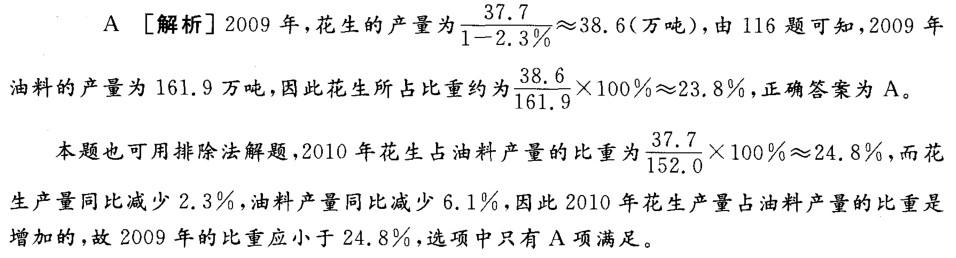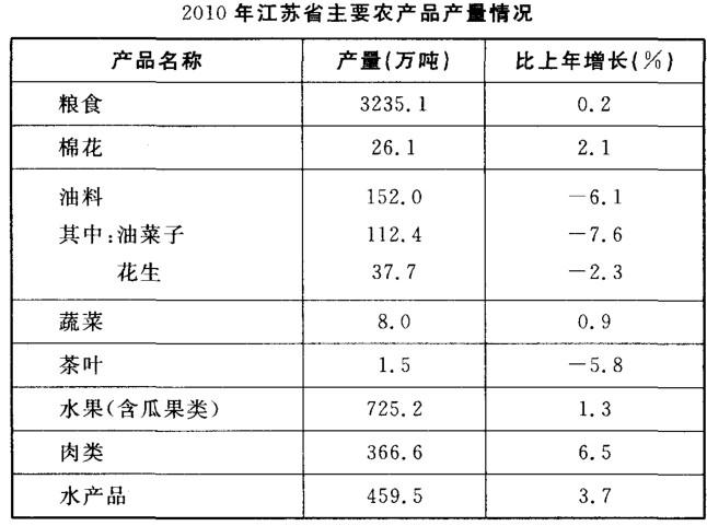问题 2010年,江苏省全年粮食总产量达3235.1万吨,比上年增加5万吨;其中夏粮1105.3万吨,增长0.2%;秋粮2129.8万吨,增长0.1%。全年粮食面积为528.2万公顷,比上年增加1. 0万公顷;棉花面积为23.6万公顷,减少1.7万公顷;油料面积57.4万公顷,减少1.9万公顷;蔬菜面积121.3万公顷,增加6.5万公顷。 2010年,江苏省全年肉类总产量366.6万吨,比上年增长6.5%,其中猪、牛、羊肉产量224.0万吨,增长4.1%;禽肉产量132.7万吨,增长10.2%。禽蛋总产量190.6万吨,增长2.9%。全年水产品总产量459.5万吨,增长3.7%,其中淡水产品324.0万吨,海水产品135.5万吨,分别增长3. 6%和3.9%。 2009年,江苏省油料产量中,花生产量所占的比重约为( )。 A. 23.8% B. 24. 8% C. 25.2% D. 28. 6%