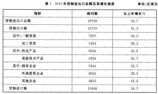 2010年,我国全年货物进出口总额29728亿美元,比上年增长34. 7%。其中,货物出口 15779亿美元,增长31. 3%;货物进口 13948亿美元...