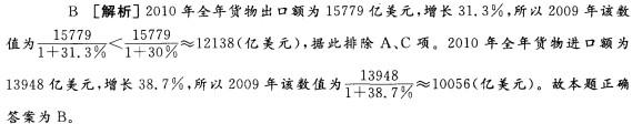 问题 2010年,我国全年货物进出口总额29728亿美元,比上年增长34. 7%。其中,货物出口 15779亿美元,增长31. 3%;货物进口 13948亿美元,增长38. 7%。进出口差额1831亿美元, 比上年减少126亿美元。 2009年全年货物出口额和进口额分别约为多少亿美元?() A. 13450 11060 B. 12018 10056 C. 13246 10060 D. 12018 11060