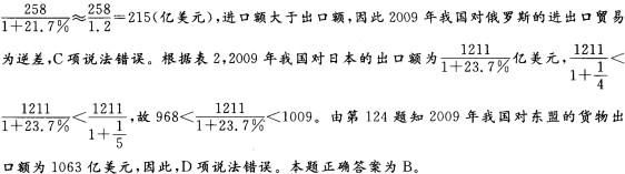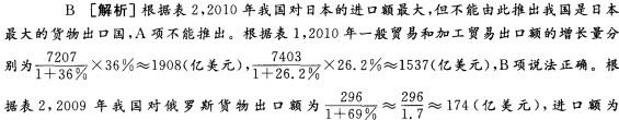 问题 2010年,我国全年货物进出口总额29728亿美元,比上年增长34. 7%。其中,货物出口 15779亿美元,增长31. 3%;货物进口 13948亿美元,增长38. 7%。进出口差额1831亿美元, 比上年减少126亿美元。 能够从上述资料中推出的是( )。 A.我国是日本2010年最大的货物出口国 B.2010年一般贸易出口额的增长量多于加工贸易出口额的增长量 C. 2009年我国对俄罗斯的进出口贸易为顺差 D. 2009年我国对东盟的出口额少于对日本的出口额