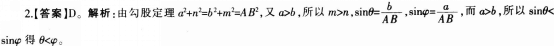 问题 如图,α⊥β,α∩β=l,A∈α,B∈β,A,B到l的距离分别是a和b, AB与a,β所成的角分别是θ和φ,AB在α,β内的射影分别是m和n,若a>b,则( )。