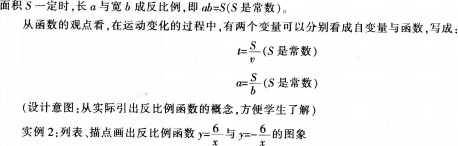 解析 (1)实例l: 我们在小学学过反比例关系,例如:当路程|s一定时,时间t与速度口成反比例即vt=S(S是常数);当矩形 (设计意图:由于学生第一次接触反比例函数,无法推测出它的大致图象,取点描图有助于学生深刻的了解反函数图象。) (2)教学重点:结合图象分析总结出反比例函数的性质: (3)教学难点:描点画出反比例函数的图象。 (4)教学导人: ①引出反比例函数的概念: 如上例,当路程S是常数时,时间T就是v的反比例函数。当矩形面积.S是常数时,长a是宽b的反比例函数。 在现实生活中,也有许多反比例关系的例子。可以组织学生进行讨论。 ②观察图象,归纳、总结出反比例函数的性质 前面学习了三类基本的初等函数,有了一定的基础,这里可视学生的程度或展开全面的讨论,或在老师的引导下完成知识的学习。 显示这两个函数的图象,提出问题:你能从图象上发现有关反比例函数的什么性质呢 并能从解析式或列表中得到论证。 (5)小结: 本节课我们学习了反比例函数的概念及其图象的性质,大家展开了充分的讨论,对函数的概念、函数的图象的性质有了进一步的认识。数学学习要求我们要深刻地理解,找出事物间的普遍联系和发展规律,能数学地发现问题,并能运用已有的数学知识,给以一定的解释。即数学是世界的一个部分,同时又隐藏在世界中。