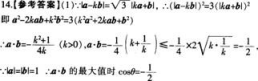 已知向量a,b,满足|a|=|b|=1,且|a-kb|=√3|ka+b|,其中k>0。 (1)试用k表示a b,并求出a b的最大值及此时a与b的夹角...