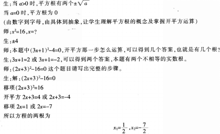解析 (1)该同学在开平方3x+1=2这一步出现了错误.原因是对平方根的概念没有掌握:其次在最后得出根z=1/3这一步也出现了错误,原因是对一元二次方程根的个数及写法没有掌握。 (2)师:32= (-3)2= 生:9 师:根据平方根的定义。9的平方根为多少 生:3 师:a(a≥0)的平方根为多少 师:非常好。步骤也很完整。以后注意细节,继续努力。(由易到难,由浅入深,让学生能运用开平方法解方程) 在整个辅导教学片段中,通过师生问答形式,根据学生已有的知识提出问题,启发学生反思自己做题中的错误以及错误的原因所在,帮助学生真正领悟开平方法解方程的正确解题方法,并通过巩固练习的方式,一步一步,由易到难,由具体到抽象促进能力的提高。 (3)①公式法: ②因式分解法