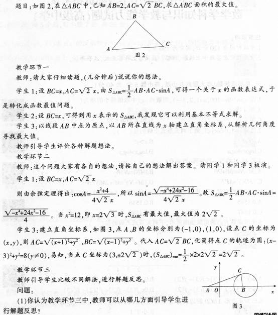 解析 (1)引导学生剖析错解,引发反思意识;引导学生反思分析挫折的经历,积累解题经验;引导学生反思解题过程,变式推广问题;引导学生反思解题结果,引申已有结论。 (2)求最值,待定系数法。 (3)对我的启发很大,首先我认为,教师要成为学生数学学习活动的组织者、引导者与合作者,作为一名新课改的合格老师应做到以下:①数学课程应致力于实现义务教育阶段的培养目标,要面向全体学生,适应学生个性发展的需要。使得:人人都能获得良好的数学教育,不同的人在数学上得到不同的发展。②课程内容要反映社会的需要、数学的特点,要符合学生的认知规律。它不仅包括数学的结果,也包括数学结果的形成过程和蕴涵的数学思想方法。课程内容的选择要贴近学生的实际,有利于学生体验与理解、思考与探索。课程内容的组织要重视过程。处理好过程与结果的关系;要重视直观,处理好直观与抽象的关系;要重视直接经验,处理好直接经验与间接经验的关系。课程内容的呈现应注意层次性和多样性。③教学活动是师生积极参与、交往互动、共同发展的过程。有效的教学活动是学生学与教师教的统一,学生是学习的主体,教师是学习的组织者、引导者与合作者。 数学教学活动应激发学生兴趣,调动学生积极性,引发学生的数学思考,鼓励学生的创造性思维;要注重培养学生良好的数学学习习惯.使学生掌握恰当的数学学习方法。 学生学习应当是一个生动活泼的、主动的和富有个性的过程。除接受学习外,动手实践、自主探索与合作交流同样是学习数学的重要方式。学生应当有足够的时间和空间经历观察、实验、猜测、计算、推理、验证等活动过程。 教师教学应该以学生的认知发展水平和已有的经验为基础,面向全体学生,注重启发式和因材施教。教师要发挥主导作用,处理好讲授与学生自主学习的关系,引导学生独立思考、主动探索、合作交流,使学生理解和掌握基本的数学知识与技能、数学思想和方法,获得基本的数学活动经验。