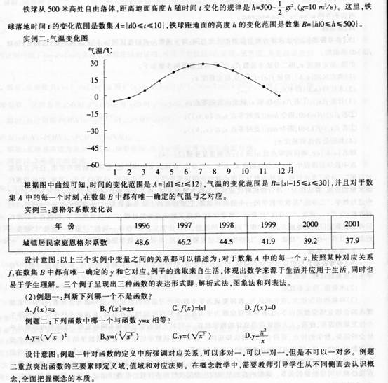 问题 高中“函数概念”(第一节课)设定的教学目标如下: ①通过丰富实例,进一步体会函数是描绘变量之间的依赖关系的重要数学模型,体会数学应用的广泛性:体会函数的实质是两个集合间的特殊对应关系; ②理解函数表达形式的多样性 ③理解函数的定义。 完成下列设计,并且回答问题: (1)根据教学目标①②,至少设计三个实例,并说明设计意图。 (2)根据教学目标③,至少设计两个例题.并说明设计意图。 (3)本节函数概念教学与初中函数概念教学有什么不同 本节课教学的重点、难点各是什么 请说明理由。