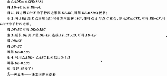 解析 (1)该课程设定需要使学生达到: ①经历“探索一发现一猜想一证明”的过程,进一步发展推理论证能力。 ②能够用多种方法证明三角形的中位线定理,体会在证明过程中所运用的归纳、类比、转化等数学思想方法。 ③能够应用三角形的中位线定理进行有关的论证和计算,逐步提高学生分析问题和解决问题的能力。 (2)教学重点与难点 教学重点:三角形中位线的概念与三角形中位线定理的证明。 教学难点:三角形中位线定理的多种证明。 (3)教学过程 ①一道趣题——课堂因你而和谐 问题:你能将任意一个三角形分成四个全等的三角形吗 这四个全等三角形能拼凑成一个平行四边形吗 (板书) (这一问题激发了学生的学习兴趣,学生积极主动地加入到课堂教学中,课堂气氛变得较为和谐,课堂也鲜活起来了。) 学生想出了这样的方法:顺次连接三角形每两边的中点,看上去就得到了四个全等的三角形。将AADE绕E点沿顺(逆)时针方向旋转l800可得平行四边形ADFE。 问题:你有办法验证吗 ②一种实验——课堂因你而生动 学生的验证方法较多.其中较为典型的方法如下:生l:沿DE、DF、EF将画在纸上的AABC剪开,看四个三角形能否重合。生2:分别测量四个三角形的三边长度,判断是否可利用“SSS”来判定三角形全等。生3:分别测量四个三角形对应的边及角,判断是否可用“SAS、ASA或AAS”判定全等。 引导:上述同学都采用了实验法,存在误差,那么如何利用推理论证的方法验证呢 ③一种探索——课堂因你而鲜活 师:把连接三角形两边中点的线段叫做三角形的中位线。(板书) 问题:三角形的中位线与第三边有怎样的关系呢 在前面图l中你能发现什么结论呢 (学生的思维开始活跃起来,同学之间开始互相讨论,积极发言) 猜想:三角形的中位线平行于第三边,且等于第三边的一半。(板书) 师:如何证明这个猜想的命题呢 生:先将文字问题转化为几何问题然后证明。 已知:DE是ABC的中位线,求证:DE//BC、DE--0.5BC。学生思考后教师启发:要证明两条直线平行,可以利用。三线八角”的有关内容进行转化,而要证明一条线段的长等于另一条线段长度的一半,可采用将较短的线段延长一倍,或者截取较长线段的一半等方法进行转化归纳。(学生积极讨论,得出几种常用方法.大致思路如下) 生l:延长DE到F使EF=DE.连接CF 问题:三角形的中位线与中线有什么区别与联系呢 容易得出如下事实:都是三角形内部与边的中点有关的线段。但中位线平行于第三边,且等于第三边的一半,三角形的一条中位线与第三边上的中线互相平分。(学生交流、探索、思考、验证) ⑤一种照应——课堂因你而完整 问题:你能利用三角形中位线定理说明本节课开始提出的趣题的合理性吗 (学生争先恐后回答.课堂气氛活跃) ⑥一句总结——课堂因你而彰显无穷魅力 学生总结本节内容:三角形的中位线和三角形中位线定理。(另附作业) ⑦课后反思 本节课以“如何将一个任意三角形分为四个全等的三角形”这一问题为出发点,以平行四边形的性质定理和判定定理为桥梁,探究了三角形中位线的基本性质和应用。在本节课中,学生亲身经历了“探索一发现一猜想一证明”的探究过程,体会了证明的必要性和证明方法的多样性。在此过程中,笔者注重新旧知识的联系,同时强调转化、类比、归纳等数学思想方法的恰当应用,达到了预期的目的。
