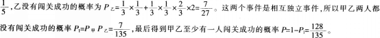 解析 (1)先求甲乙两人都没有闯关成功的概率Pl,甲没有成功即甲抽取的3道题里只有一道能答对 (2)ξ的可能取值为1,2。