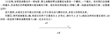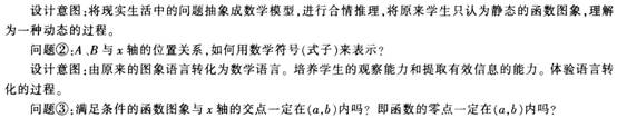 解析 (1)问题引入:求方程3x2+6x-l=0的实数根。 变式:解方程氩3x5+6x-l=0的实数根。(一次、二次、三次、四次方程的解都可以通过系数的四则运算,乘方与开方等运算来表示,但高于四次的方程不能用公式求解。大家课后去阅读本节后的“阅读与思考”。还有如lnx+2x-6=0的实数根很难下手,我们寻求新的角度——函数来解决这个方程的问题。) 设计意图:从学生的认知冲突中,引发学生的好奇心和求知欲,推动问题进一步的探究。通过简单的引导,让学生课后自己阅读相关内容,培养他的自学能力和更广泛的兴趣。开门见山的提出函数思想解决方程根的问题。点明本节课的目标。 (2)问题①:求方程x2-2x-3=0的实数根,并画出函数y= x2-2x-3的图象; 问题②:观察形式上函数y= x2-2x-3与相应方程x2-2x-3=0的联系。 问题③:由于形式上的联系,则方程x2-2x-3=0的实数根在函数y= x2-2x-3的图象中如何体现 设计意图:以学生熟悉二次函数图象和二次方程为平台,观察方程和函数形式上的联系,从而得到方程实数根与函数图象之间的关系。理解零点是连接函数与方程的结点。 (4)教学重点:了解函数零点的概念,体会方程的根与函数零点之间的联系,掌握函数零点存在性的判断。 (5)教学难点:准确认识零点的概念,在合情推理中让学生体会到判定定理的充分非必要性,能利用适当的方法判断零点的存在或确定零点。 (6)本节课是在学生学习了《基本初等函数(I)》的基础上,学习函数与方程的第一课时,本节课中通过对二次函数图象的绘制、分析,得到零点的概念,从而进一步探索函数零点存在性的判定。这些活动就是想让学生在了解初等函数的基础上,利用计算机描绘函数的图象,通过对函数与方程的探究,对函数有进一步的认识,解决方程根的存在性问题,为下一节《用二分法求方程的近似解》做准备。