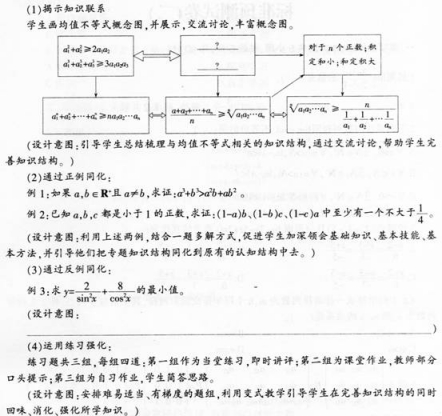 解析 (2)例3的设计意图:通过例3剖析错解、引出正确的教学策,把学生置于原有认知结构与新问题矛盾的冲突之中,引导他们顺应新问题、新体会,调整原有认知结构从而达到新平衡。 (3)知识与技能目标:掌握均值不等式,能根据问题条件的需要灵活运用均值不等式解决相关问题。 过程与方法目标:通过相关知识的梳理,以及正例同化与反例顺应,优化认知结构,进一步发展恒等变形与转化化归的能力,发展思维的灵活性与创新性。 情感态度与价值观目标:经历知识的系统化过程,感受数学知识的内在联系,领悟数学知识的生长规律;经历师生、生生交流、合作与探究、批判与反思,增进理性思维的发展,并获得成功的体验。 (4)上述教学过程,基本符合教学要求、学生实际,反映了新课程的基本理念。而且,教学过程设计比较具体,可操作性强,能保证教学目标的实现。但有两个环节不容易把握:一是对知识结构梳理;二是利用反例顺应。这两个环节也是引导学生进行高水平认知活动的重要环节,对于学生的不同想法,教师应只引申和明确,不能限制学生的思路,要给教学的动态生成以充分的空间和时间。