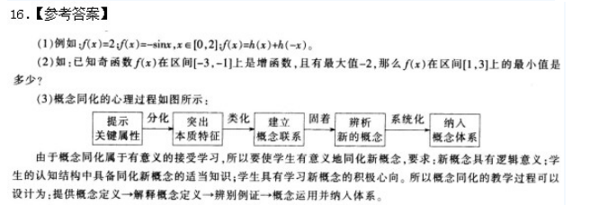 问题 案例: 概念同化指从已有概念出发,理解并接纳新概念的过程,实质是利用演绎方式理解和掌握概念。由于数学中大多数概念是以属概念加种差的方式定义的,所以适宜采用概念同化的方式进行教学。以“奇函数,,概念教学为例简要说明概念同化的教学模式: (1)向学生提供“奇函数”概念的定义 (2)解释定义中的词语、符号、式子所代表的含义 突出概念刻画的是:对定义域中的任意一个自变量菇,考察χ与-χ对应的函数值f(χ)与f(-χ)之间的关系以f(-χ)=-f(χ)。因此函数的定义域应该关于原点对称,满足这个条件后再考察f(-χ)=-f(χ). (3)辨别例证,深化概念 教师向学生提供丰富的概念例证,例证中以正例为主,但也要包合适"-3的反例,尤其是一些需要考察隐含条件的例子。 (4)概念的运用 提供各种形式来运用概念,达到强化对概念的理解,促进概念体系的建构的目的,可以利用个别有一定综合性但难度不大的问题。 问题:(1)请举出反例说明(3)辨别例证,深化概念。(5分) (2)请举例补充(4)概念的运用。(5分) (3)请结合案例,总结出概念同化的教学模式的过程。(10分)