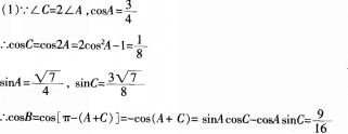 问题 在ABC中,已知A,B,C对应的边分别为a,b,c,且 (1)求cosC和cosB的值: (2)当时,求a,b,c的值。