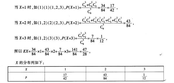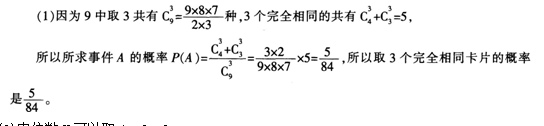问题 一盒中装有9张各写有一个数字的卡片,其中4张卡片上的数字是l,3张卡片上的数 字是2,2张卡片上的数字是3,从盒中任取3张卡片。(1)求所取3张卡片上的数字完全相同的概率;(2)x表示所取3张卡片上的数字的中位数,求X的分布列和EX。