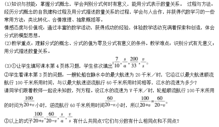 问题 新课程内容标准中对第三学段中整式与分式的具体目标设置为“了解分式的概念,会利用分式的基本性质进行约分与通分,会进行简单的分式加、减、乘、除运算”,结合上述内容,对“分式(第一课时)”进行教学设计。 (1)本节课的教学目标是什么 (2)本节课的教学重点和难点是什么 (3)请为本节课的教学设计一个课程导入。