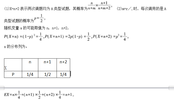 问题 某单位招聘面试,每次从试题库调用一道试题,若调用的是A类型试题,则使用后该试题回库,并增补一道A类型试题和一道B类型试题入库,此次调题工作结束;若调用的是B类型试题,则使用后该试题回库,此次调题结束。试题库中现有n+m道试题,其中有n道A类型试题和m道B类型试题,以x表示两次调题工作完成后,试题库中A类型试题数量。 (1)求X=n+2的概率; (2)设n=m,求X的分布列和均值.