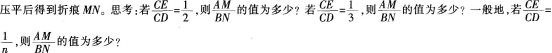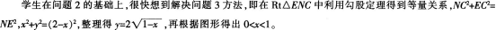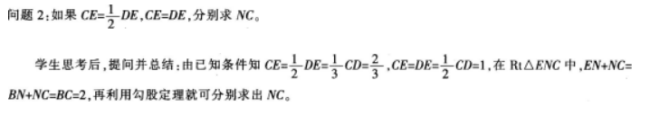 解析 (1)本题具有开放性,题目设置合理即可。下面是几个示例: 设正方形纸片△BCD边长为2. ①E在什么位置时,△ENC是一个角为30°的直角三角形; ②试写出NC与EC的数量关系; ③求E在什么位置时,AENC的面积取得最大值; (2)导入: 采用练习导入法,利用一个简单的练习题引入本节课内容。 新课讲授: 根据导入的例题,提出问题:在之前学习的三角形知识中,有哪些常用的性质和定理 预设:①全等三角形判定定理,②相似三角形判定定理,③等腰三角形性质,④勾股定理…… 找学生回答并追问,明确具体的性质和定理内容。 在复习之前的知识之后,结合(1)中②③进行“探究式”解题教学。 给出例题:如图所示,已知正方形纸片ABCD边长为2,将正方形纸片ABCD折叠,使B点落在CD边上一点E(不与C,D重合),压平后得到折痕MN,A点落在点F处。 问题1:根据条件,能够获得哪些结论 学生七嘴八舌地说着,教师提问后总结:AM=FM,BN=EN,Rt△ENC,MN所在的直线是BE的垂直平分线(需连接BE),∠NBE=∠NEB,∠ENC=2N∠BE,…… 问题3:如果设NC=x,EC=y,试求y关于x的函数关系式。 问题4:在问题3的基础上,我们还能得出什么结论 学生七嘴八舌地说着,教师提问后总结:可以求出Y的取值范围,可以写出△ENC周长和面积的表达式。 问题5:写出△ENC的面积关于x的函数表达式。 问题6:求E在什么位置时,△ENC的面积取得最大值 之前的几个问题都是为了解决问题6做铺垫的,在前五个问题的基础上研究问题6,几何问题已经转化成 计算部分留给学生。教师对本节课做小结:同学们,我们在学习数学的过程中要善于独立思考,学会在已知条件的基础上归纳概括得出猜想和规律,发现问题、提出问题并想办法去解决问题。要大胆的去尝试,把看起来难的问题,细化成若干个可以解决的小问题,在不断探究不断深入的过程中就会自然而然地解决问题。 作业:已知正方形ABCD边长为2,将正方形纸片ABCD折叠,使B点落在CD边上一点E(不与C,D重合),
