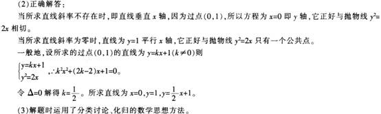 问题 案例:某教师在进行圆锥曲线的教学时,给学生出了如下一道练习题: 求过点(0,1)的直线,使它与抛物线y2=2x仅有一个公共点。 某学生的解答过程如下: 问题: (1)指出该生解题过程中的错误,分析其错误原因; (2)给出你的正确解答;(3)指出你解题所运用的数学思想方法。
