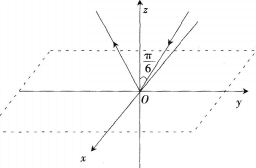 问题 一条光线斜射在一水平放置的平面镜上,入射角为π/6,请建立空间直角坐标系,并求出反射光线的方程。若将反射光线绕平面镜的法线旋转一周,求所得的旋转曲面的方程。