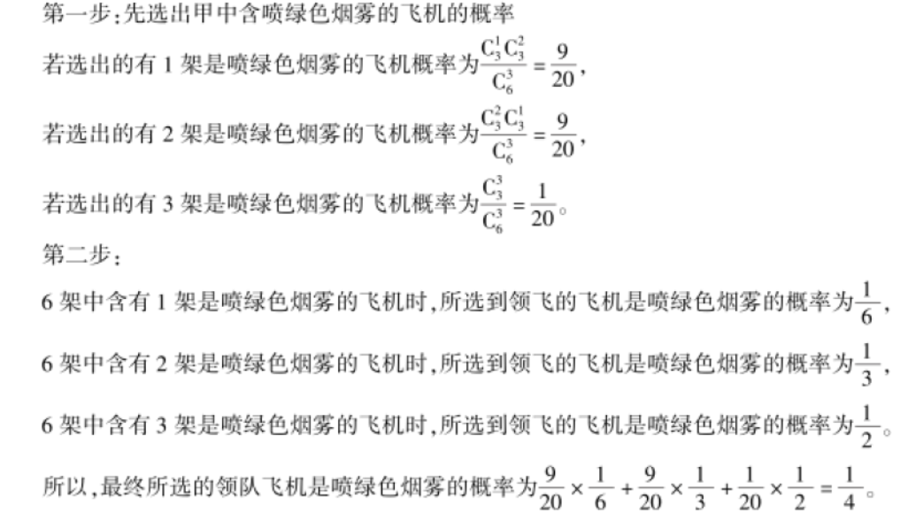 问题 某飞行表演大队由甲、乙两队组成。甲队中恰好有喷红色与绿色喷雾的飞机各3架。乙队中仅有3架喷红色烟雾的飞机。在一次飞行表演中,需要从甲队中任意选出3架飞机与乙队飞机混合编队进行表演,并任意确定一架飞机作为领飞飞机,求领飞飞机是喷绿色烟雾的概率。