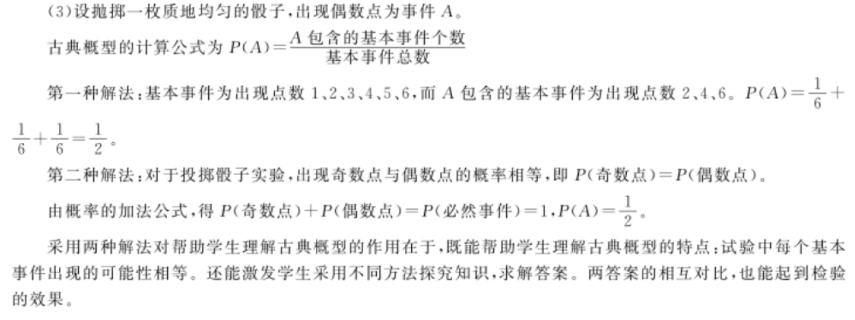 问题 《普通高中数学课程标准(实验)》关于“古典概型”的教学要求是:“古典概型的教学应让学生通过实例理解古典概型的特征:实验结构的有限性和每一个实验结果出现的等可能性,让学生初步学会把一些实际问题化为古典概型,教学中不要把重点放在‘如何计算’上”。 请完成下列任务: (1)结合上述教学要求,请设计高中“古典概型”起始课的教学目标; (2)请设计两个符合古典概型的正例,以及两个不符合古典概型的反例,以便理解古典概型的特征; (3)抛掷一枚质地均匀的骰子(六个面分别有1,2,3,4,5,6个点),请用两种不同解法求出现偶数点的概率,并说明采用两种解法对帮助学生理解古典概型的作用。