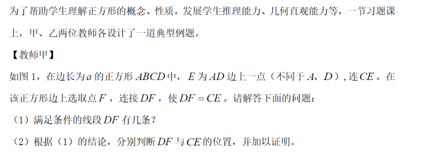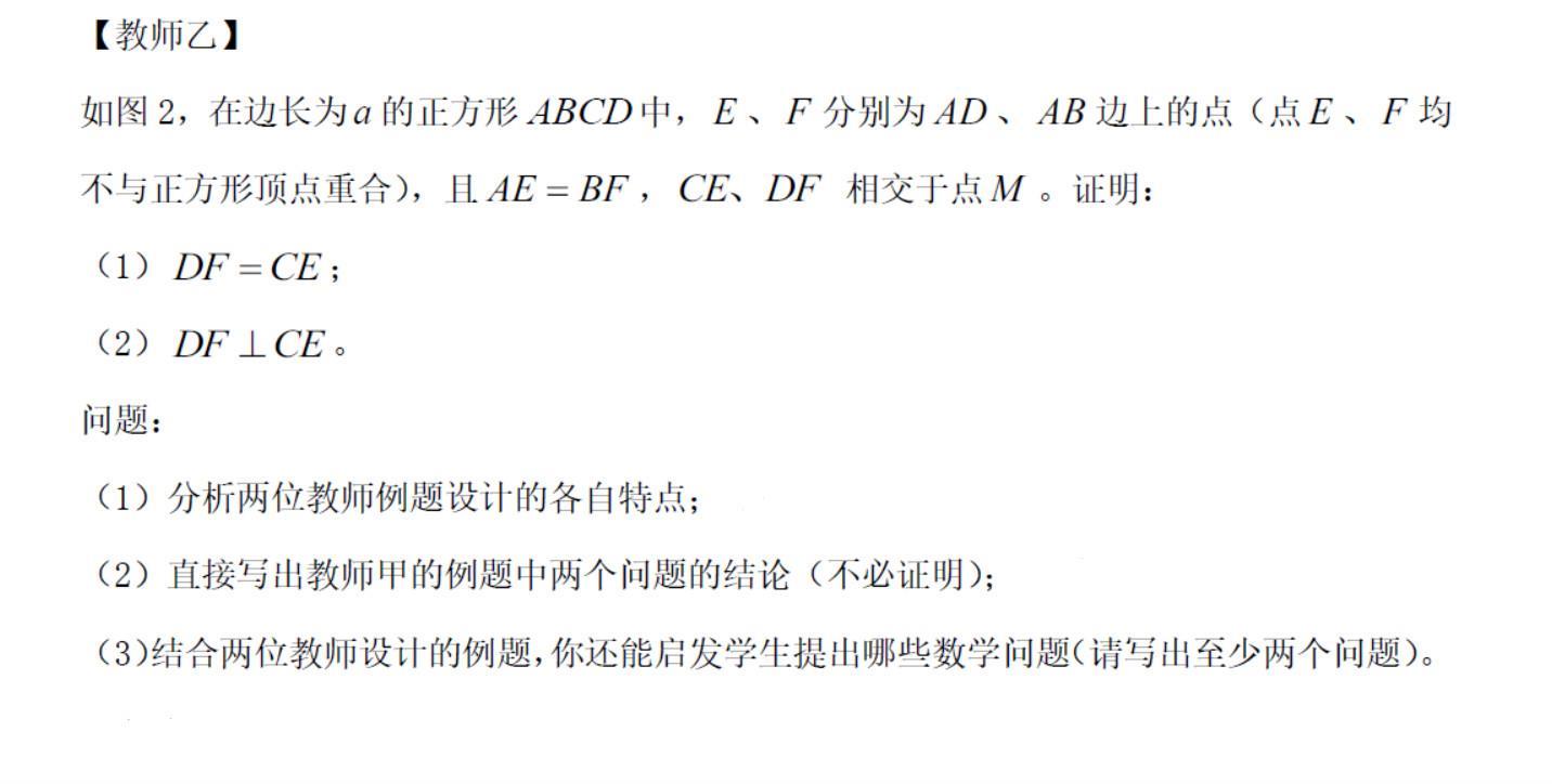 解析 (1)教师甲设计的典型例题具有开放性,诱发学生思考,符合新课标的要求“要关注学生的个体差异,有效地实施有差异的教学,使每个学生都得到充分发展”,因此在习题课上设计开放性的例题,可以满足不同学生的学习要求;具有探索性,根据新课标:“学生不仅能主动地获取知识,而且能不断丰富数学活动经验,学会探索,学会学习”的要求,在习题课上给学生提供充分从事数学活动和探索问题的时间和课件,促进学生数学知识和方法的掌握、巩固和提高。 教师乙设计的典型例题具有层次性,递进式的呈现,满足学生多样化的学习需求。设计的例题由易到难,循序渐进,一步步引导学生将问题深化,发展思维能力。