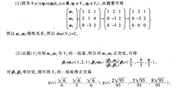 问题 在线性空间R3中,已知向量a1=(1,2,1),a2=(2,1,4),a3=(0,-3,2), 记V1={λa1+μa2|λ,μ∈R},V2={ka3|k∈R}。 令V3={t1η1+t2η2|t1,t2∈R,η1∈V1,η2∈V2}。 (1)求子空间V3的维数; (2)求子空间V3的一组标准正交基。