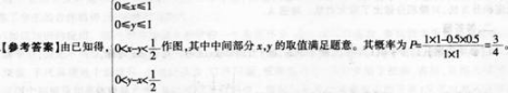 问题 在区间[0,1]中随机抽取两个数(χ,y),即(χ,y)服从[0,1]上的均匀分布。求这两个数之差的绝对值小于1/2的概率。
