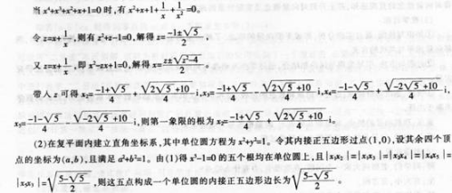 问题 方程χ5-1=0的5个根在复平面上是一个正五边形的顶点. (1)求方程χ4+χ3+χ2+χ+1=0的四个复根中落在第一象限的那个根,要求用根式表达。(提示:做变量替换z=χ+1/χ) (2)利用(1)的结论,计算单位圆的内接正五边形的边长。