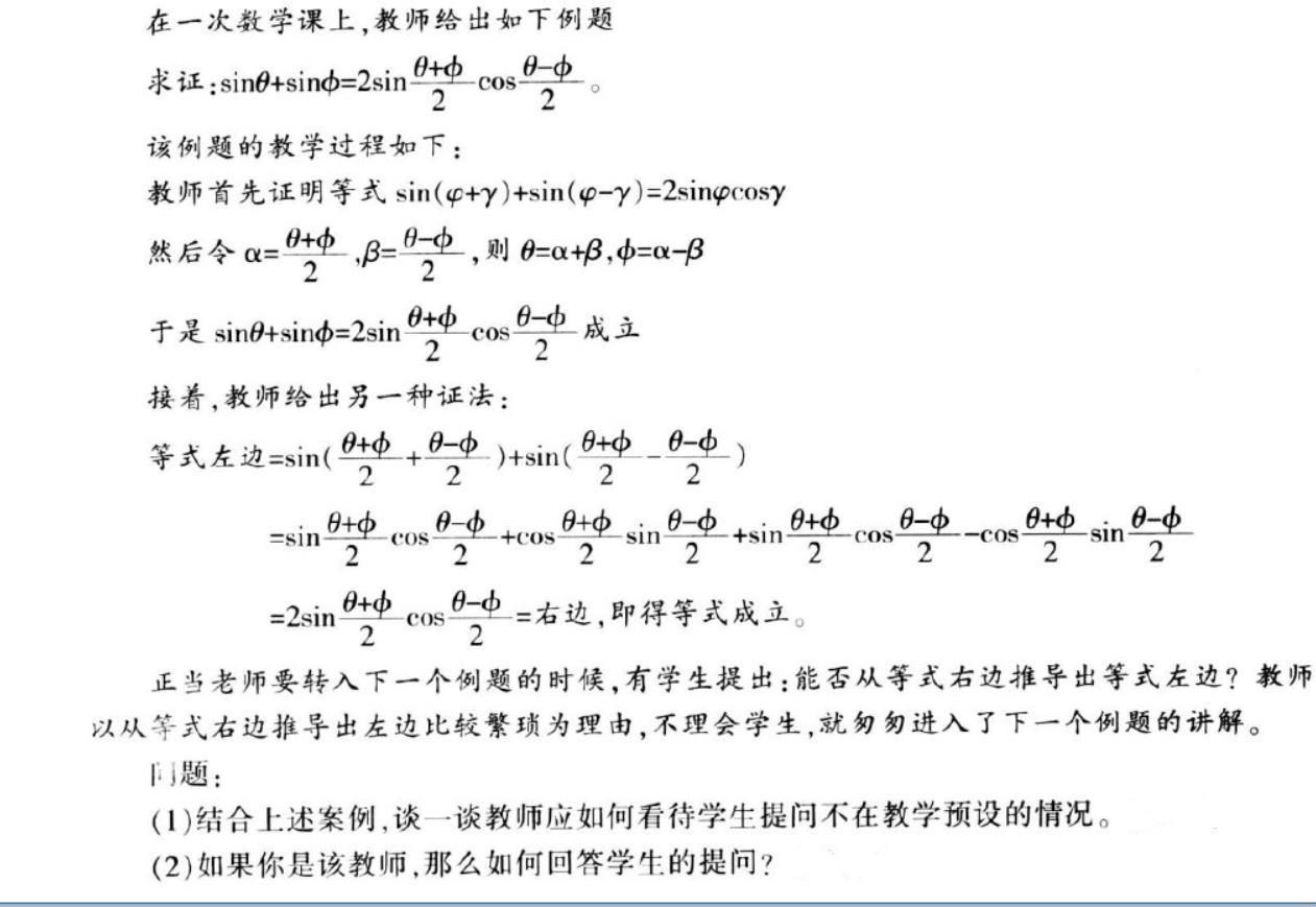 解析 (1)教师应该区别对待学生提出的问题。首先,要判断学生问题的价值,依据价值性大小给与回应。我们把与教学目标相关的问题都归为“正问题”,把偏离或背离教学目标的问题归为“负问题”。如本案例中学生的提问“能否从等式右边推导出等式左边”这一问题便是“正问题”,对待“正问题”应该给与积极回应。对学生提出的“负问题”,教师一方面可以启发引导,将其转化成“正问题”进行处理,一方面可以采取“冷处理”的办法。其次,要依据问题的内容灵活进行,如师生互动讨论或生生小组讨论,也可以让学生自行探究或课下解决。 (2)如果我是该教师我会将该问题作为一道思考题目,让学生进行小范围的讨论,最后对此三种解题方式进行分析总结。具体实施方式如下: 问题1:刚刚这位同学提出了一个很新颖的解题思路,那么我们可不可以从等式右边推导出等式左边呢?大家同桌之间讨论一下,可不可以,又是如何推导的呢? 我将在学生讨论的过程中,进行巡视并对有问题的学生加以指导,为了不耽误课堂进度,讨论时间初步预设为3分钟。 提问,请学生进行结果展示 提问:对比三种解决方法,各自的优点是什么?谈一谈你更倾向于用哪种方法解决问题? 引导学生共同总结:在解决三角函数公式证明题的时候,①合理的选择诱导公式以及和差化积公式非常的重要,如:方法三对于两角和差公式的反复运用,虽计算过程稍微复杂,但是方法更加的简单,容易想到。②能够灵活的运用整体代换的思想方法快速解决问题,如:方法一、方法二可以精简计算过程,避免计算出错。