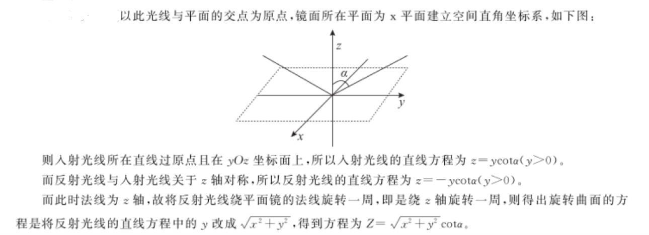 问题 一条光线斜射在一水平放置的平面镜上,入射角为α(0<α,π/2),请建立空间直角坐标系,并求出反射光线的方程。若将反射光线绕平面镜的法线旋转一周,求所得的旋转曲面的方程。