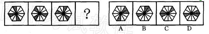 解析 題干中,阴影部分的移动是没有规律的,但我们可以看出如果前三幅图重 合起来,则阴影部分是没有重复的,因此应选择一个与前面三个圏形无重复阴影部分的田形。 故本題正确答案为A。