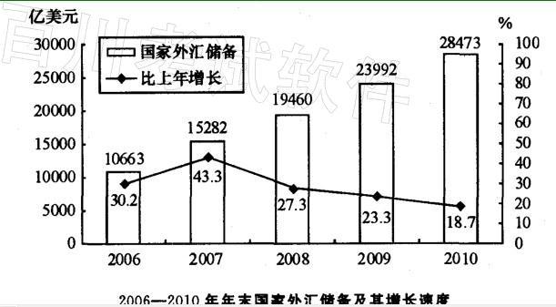 解析 根据图表可知,2006—2010年,国家外汇储备年平均增长率为(30. 2% + 43. 3%+27. 3% + 23. 3% + 18. 7%)÷5=28. 56%,而其实的增长率比 28. 56%略小,故本题 正确答案为B。