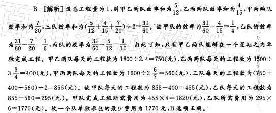 问题 某工程,由甲乙两队承包,天可以完成,需支付1800元,由乙丙两队承包,天可以完成,需支付1500元,由甲丙两队承包,天可以完成,需支付1600元。问在保证一星期内完成的提下,选择一个队单独承包的最少费用为多少?( ) A. 920 元 B. 1770 元 C. 2170 元 D. 1710 元