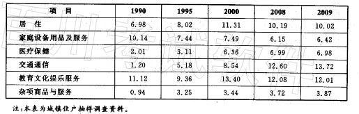 解析 A、B、C项均可从表格数据得出,D项中,2009年我国城镇居民平均每人消费性支出各项排名变化很大,如交通通信在2009年排第二位,而在1990年只排倒数第二位。