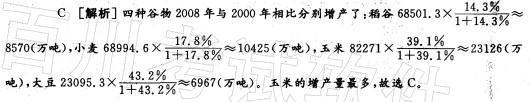 问题 根据以下资料 2008年世界稻谷总产量68501.3万吨,比2000年增长14.3%小麦总产量68994.6万吨,比2000年增长17.8%;玉米总产量82271.0万吨,比2000年增长39.1%;大豆总产量23095.3万吨,比2000年增长43.2%。 下列四种谷物中,2008年与2000年相比全世界增产量最多的是( )。 A.稻谷 B.小麦 C.玉米 D.大豆