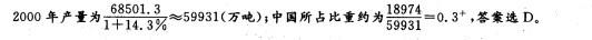 问题 根据以下资料 2008年世界稻谷总产量68501.3万吨,比2000年增长14.3%小麦总产量68994.6万吨,比2000年增长17.8%;玉米总产量82271.0万吨,比2000年增长39.1%;大豆总产量23095.3万吨,比2000年增长43.2%。 2000年,中国稻谷产量占世界稻谷总产量的比重约为( )。 A. 20% B. 24% C. 28% D. 32%
