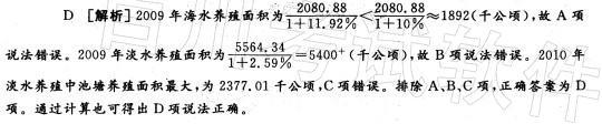 问题 根据以下资料 2010年全国水产养殖面积比上年增长4.97%。其中,海水养殖面积2080.88千公顷,占水产养殖总面积的27.21%,比上年增长11.92%;淡水养殖面积5564.34千公顷,占水产养殖总面积的72. 79%,比上年增长2.59%。 海水养殖面积:鱼类养殖面积为78.51千公顷,比上年降低5.65%;甲壳类养殖面积310. 78千公顷,比上年增长2.60%;贝类养殖面积1308.00千公顷,比上年增长13.35%;藻类养殖面积120.20千公顷,比上年增长8.68%。 淡水养殖面积:池塘养殖面积2377.Ol千公顷,比上年增加45.1千公顷,增长1.93%;水库养殖面积1795.58千公顷,比上年增加69.17千公顷,增长4.01%;湖泊养殖面积1007.10千公顷,比上年增加8.87千公顷,增长0.89%;河沟养殖面积264.13千公顷,比上年增加14.45千公顷,增长5.79%;其他养殖面积120.53千公顷,比上年增加2.92千公顷,增长2.48%;稻田养成鱼面积1326.11千公顷,比上年减少13.60千公顷,降低1. 02%。 下列各项中说法正确的是( )。 A. 2009年海水养殖面积超过1900千公顷 B. 2009年淡水养殖面积不足5200千公顷 C. 2010年淡水养殖中水库养殖面积最大 D. 2010年贝类养殖面积超过海水养殖面积的60%