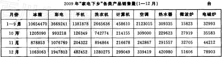 2009年,各类家电产品销售量从髙到低排序在第四位的是( )。A.洗衣机 B.空调 C.手机 D.热水器