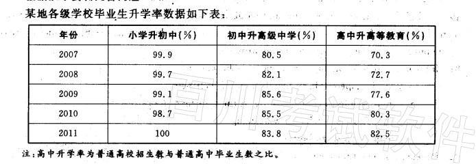 解析 有表格数据可知,2009年初中升高级中学的升学率是85.6%,2010年是85.5%,因此2010年比2009年低0.1%。