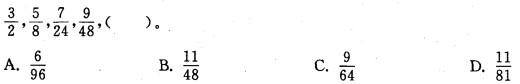 解析 分数数列。各项分子构成等差数列,下一项为11;各项分母的后项除以前项依次得4,3,2,下一项为48×1=48,故空缺项为11/48,本题选B。