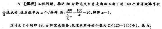 问题 王师傅计划用2小时加工一批零件,当还剩160个零件时,机器出现故障,效率比原来降低1/5,结果比原计划推迟20分钟完成任务,这批零件有()个。 A. 240 B. 200 C. 160 D. 150