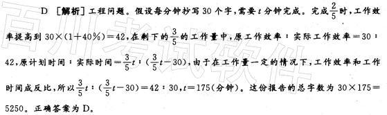 问题 王明抄写一份报告,如果每分钟抄写30个字,则用若干小时可以抄完。当抄完2/5时,将工作效率提高40%,结果比原计划提前半小时完成。问这份报告共有多少字?() A. 6025 字 B. 7200 字 C. 7250 字 D. 5250 字