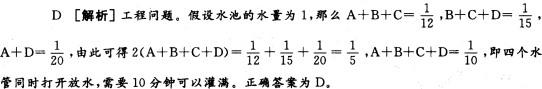 问题 将A、B、C三个水管打开向水池放水,水池12分钟可以灌满;将B、C、D三个水管打开向水池放水,水池15分钟可以灌满;将A、D两个水管打开向水池放水,水池20分钟可以灌满。如果将A、B、C、D四个水管打开向水池放水,水池须多少分钟可以灌满?( ) A. 25 B. 20 C. 15 D. 10