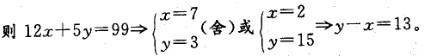 问题 超市将99个苹果装进两种包装盒,大包装盒每个装12个苹果,小包装盒每个装5个苹果,共用了十多个盒子刚好装完。问两种包装盒相差多少个?() A. 3 B. 4 C. 7 D. 13