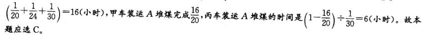 问题 有A、B两堆同样多的煤,如果只装运一堆煤,那么甲车需要20小时,乙车需要24小时,丙车需要30 小时。现在甲车装运A堆煤,乙车装运B堆煤,丙车开始先装运A堆煤,中途转向装运B堆煤,三车同时开始,同时结束装完这两堆煤。丙车装运A堆煤用了多少时间?() A. 2小时 B. 5小时 C. 6小时 D. 8小时