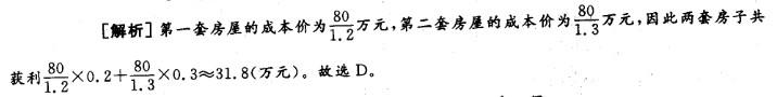 问题 某房地产公司分别以80万人民币的相同价格出售两套房屋。一套房屋以盈利20%的价格出售,另一套房屋以盈利30%的价格出售。那么该房地产公司从中获利约为( )。 A. 31. 5万元 B. 31. 6万元 C. 31. 7万元 D. 31. 8万元