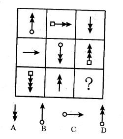 解析 本题中横向看,三行图形中箭头总数均为6,故问号处的图形应有一个箭头,排除A、 D,各行中都有以圆为出发点的图形,且方向包含上、下、右,故本题正确答案应为C。
