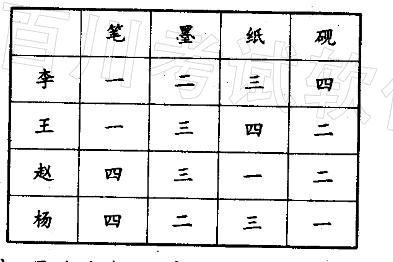 解析 列表如下: 从起、杨入手,小起一个也没猜对,因此小杨的第四层猜错。又知小杨猜对两个,小李猜对一个,而小李的第二层与第三层和小杨猜的相同,因此这两层中只能有一个正确,故小杨第一层猜对,即砚在第一层。至此,已可选出正确答案。再往下看,第一层不是笔,第二层不是砚,若小杨猜的第三屋正确,那么小王就一个也没猜对,排除。则小杨猜的第二层正确,即第二层是墨,则小王猜的第四层正确,是纸。笔、 墨、纸、砚分别在第三层、第二层、第四层、第一层。本题正确答案为D。
