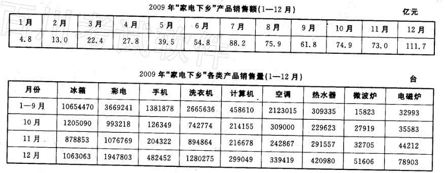 2009年,各类家电产品销售量从高到低排序在第四位的是( )。A.洗衣机 B.空谪 C.手机 D.热水器